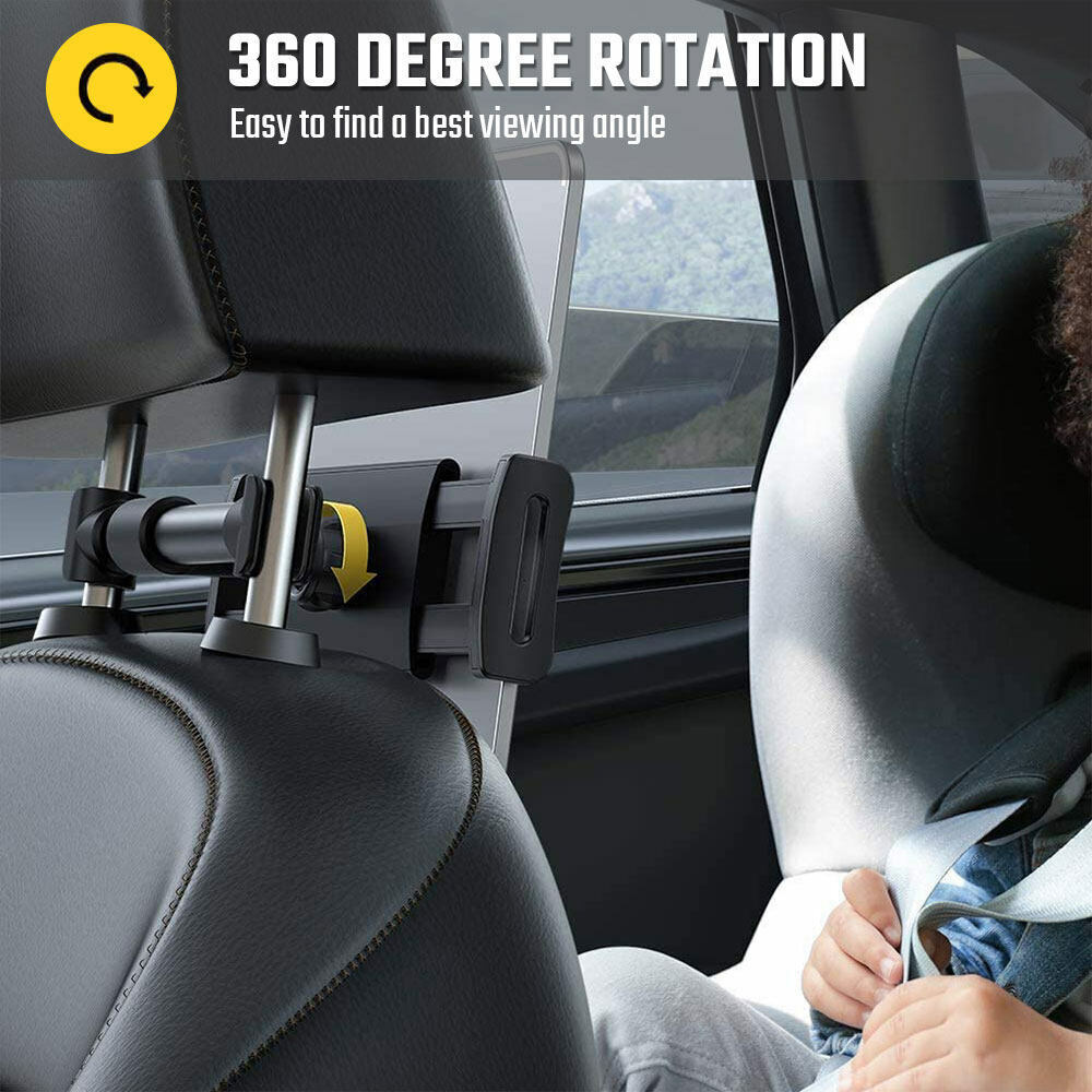 The tablet headrest holder makes it easy for you to mount your device to the headrest in the car. By firmly attaching the holder, you can get the max flexibility of the best viewing perspective. Retractable clamp fits different size devices. The 360 degrees of fluid rotation offers you an effortless angle change of your device, portrait to landscape or vice versa. It provides you with the ultimate entertainment experience for your backseat children or any other passengers. 360-degree rotation allows you to rotate at any angle you desired, you only need to adjust the expandable leg of the backseat headrest mount, so it can be installed immediately.The soft EVA rubber coated protects your devices from friction, the telescoping arms can effectively prevent vibration while firmly grasping your rear seat and devices. Universal headrest iPad holder will bring you great fun when watching movies, reading, playing games and listening to music with no hands during long car journeys.This updated version of the car headrest phone mount can be adapted to more car models. Headrest rod distance adaptation range: 4.7 - 11 inch.
